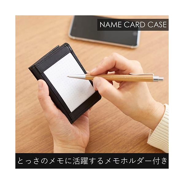 とっさのメモに活躍する便利なメモホルダー付きです。合皮製名刺整理に便利な2層式。