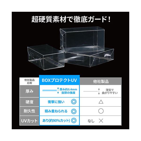 本製品で採用したPET素材は0.4mmの厚みで構成されており、他社類似品0.2mm〜0.25mmから比較すると、約2倍近い硬度となっています。ディスプレイやコレクションとしてトレカBOXを積み上げた時でも保護ケースが潰れにくい仕様です。(耐荷重5kg目安)