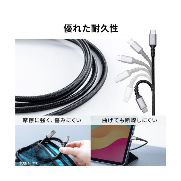 ●外皮にポリエステルメッシュを採用しており、高密度編組で覆われて強度と靭性が高く断線しにくいケーブルです。