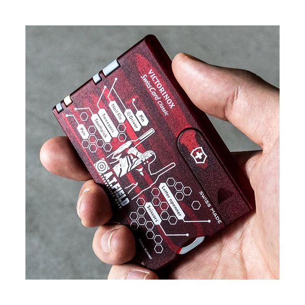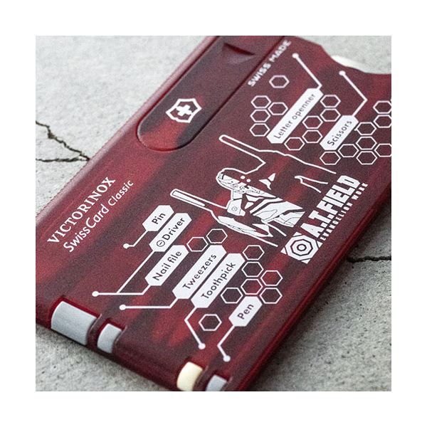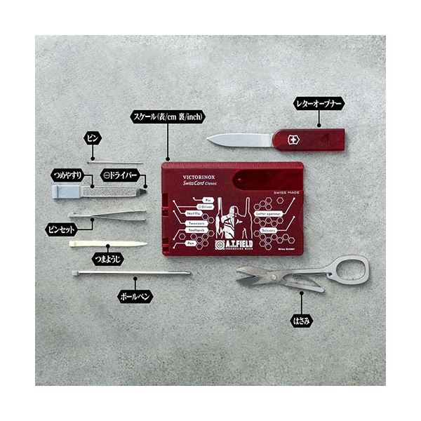 ●「A.T.FIELD EVANGELION WORK」と、1884年スイスでナイフメーカーとして創業以来、高品質・高機能なマルチツールを製造し続ける「ビクトリノックス」の代表的な商品「スイスカード」がコラボレーションした、カード型マルチツール。日常的に使うことができる10個のツールをスマートに携帯することが可能。
