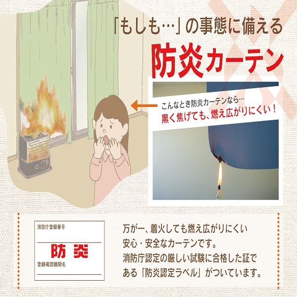 防炎加工で、もしもの時の燃え広がりを防ぎます。「防炎」表示ラベルの縫い込み付きです。