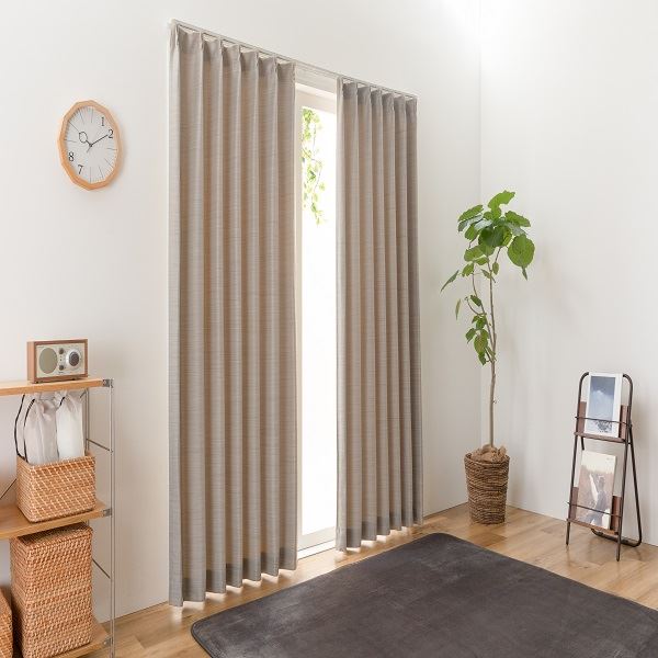 ネイビーとベージュの2配色展開。ネイビーは2級遮光、ベージュは3級遮光の遮光機能が付いたドレープカーテンです。生地はしっかりとした厚みがあります。お部屋が暗くなりすぎず光を程よく取り込めます。ウェーブを綺麗に保つ“形状記憶加工”を施しており、洗濯しても型崩れしません。 同色のタッセルと アジャスターフック(Aフック)が付属されております。