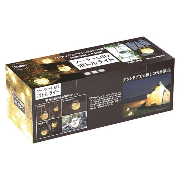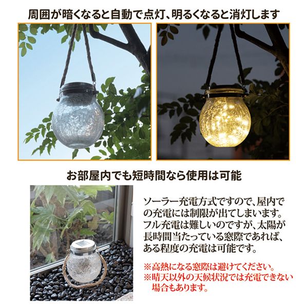 クラックデザインボトルに多くのLED球で、煌めく輝きを演出してくれるエクステリアに最適なソーラー充電式のLEDランプです。ガーデンや玄関先、テラスでお過ごしの時のイメージアップにオススメです。複数のLED照明が、クラックデザインのガラスボトルに乱反射することで、光の拡がりを感じていただけます。フタ部分にソーラーパネルが内蔵されてますので、日中に太陽光にしっかりと当てて充電してください。置いても吊り下げてもご使用できるデザインになってます。明るさセンサーがパネル部分に内蔵されてますので、周囲が暗くなると自動で点灯します。周囲が明るくなると自動で消灯します。