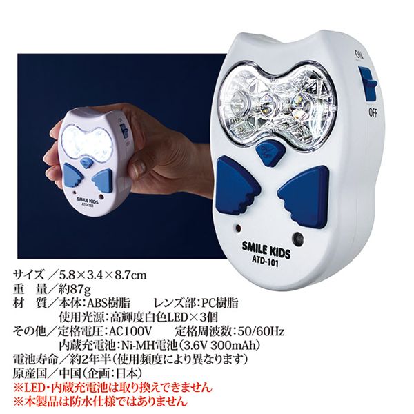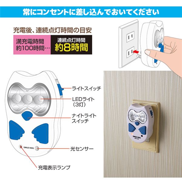夜中に突然の停電で、慌てて懐中電灯を探したりした経験はありませんか。停電と同時にライトが光ってくれると安心ではないでしょうか。この停電灯は、まさに停電した時に点灯する仕組みの充電型ライトです。コンセントに差し込んで置くだけでOK。コンセントからの家庭電源が通電しなくなるとスイッチが入ります。そのままコンセントから抜き出しでハンドライトとして約8時間、連続点灯します。また、ナイトライトスイッチをONにし、コンセントに差し込んでおくと周囲が暗くなったのを感知して自動で点灯し足元ライトとして活用いただけます。