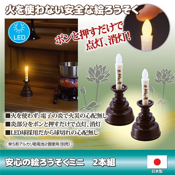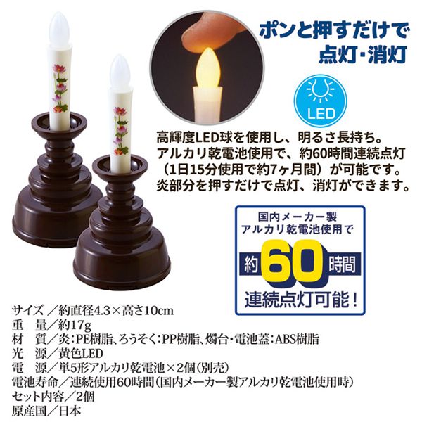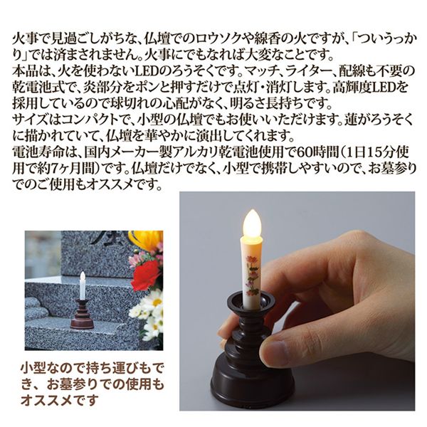 火事で見過ごしがちな、仏壇でのロウソクや線香の火ですが、「ついうっかり」では済まされません。火事にでもなれば大変なことです。本品は、火を使わないLEDのろうそくです。マッチ、ライター、配線も不要の乾電池式で、炎部分をポンと押すだけで点灯・消灯します。高輝度LEDを採用しているので球切れの心配がなく、明るさ長持ちです。サイズはコンパクトで、小型の仏壇でもお使いいただけます。蓮がろうそくに描かれていて仏壇を華やかに演出してくれます。電池寿命は、国内メーカー製アルカリ乾電池使用で60時間(1日15分使用で約7ヶ月間)です。仏壇だけでなく、小型で携帯しやすいので、お墓参りでのご使用もオススメです。