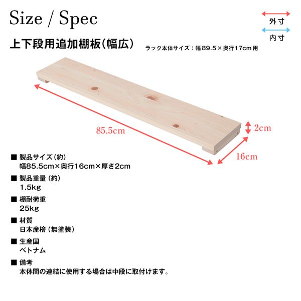 日本産ひのきの天井つっぱりシェルフ 約幅89.5cm×奥行17cm用追加棚板 上・下段用 本体別売 組立品【代引不可】