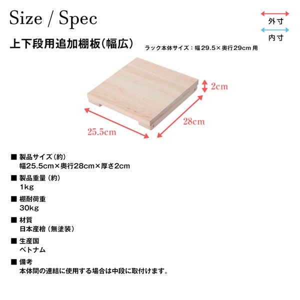 日本産ひのきの天井つっぱりシェルフ 約幅29.5cm×奥行29cm用追加棚板 上・下段用 本体別売 組立品【代引不可】
