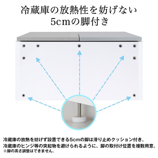 5cmの脚付きで製品と冷蔵庫の隙間をあけて、冷蔵庫の放熱性を妨げず使用できます。