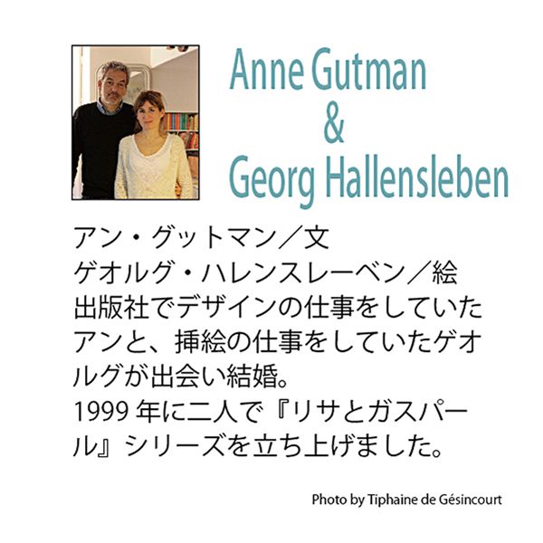 ◆フランス作家アン・グットマン/文…1970年パリ生まれ。小説家だった父の影響で、絵本の創作活動に。出版社でデザインの仕事をしている時にゲオルグと出会い、結婚。1999年に夫とともに『リサとガスパール』シリーズを立ち上げました。ゲオルグ・ハレンスレーベン/絵…1958年ドイツ生まれ。幼い頃から水彩画に親しみ、大学卒業後はローマで画家としてスタート。パリでアン・グットマンと知り合い、結婚。