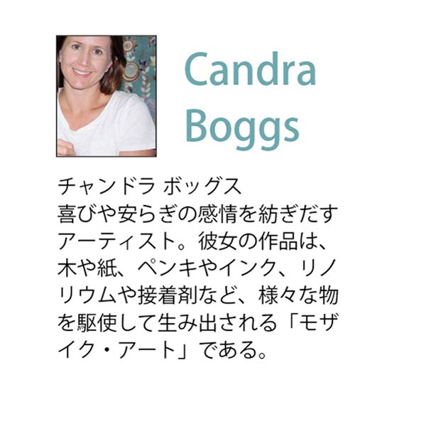 ◆チャンドラ・ボッグス…喜びや安らぎの感情を紡ぎだすアーティスト。彼女の作品は、木や紙、ペンキやインク、リノリウムや接着剤など、様々な物を駆使して生み出される「モザイク・アート」である。