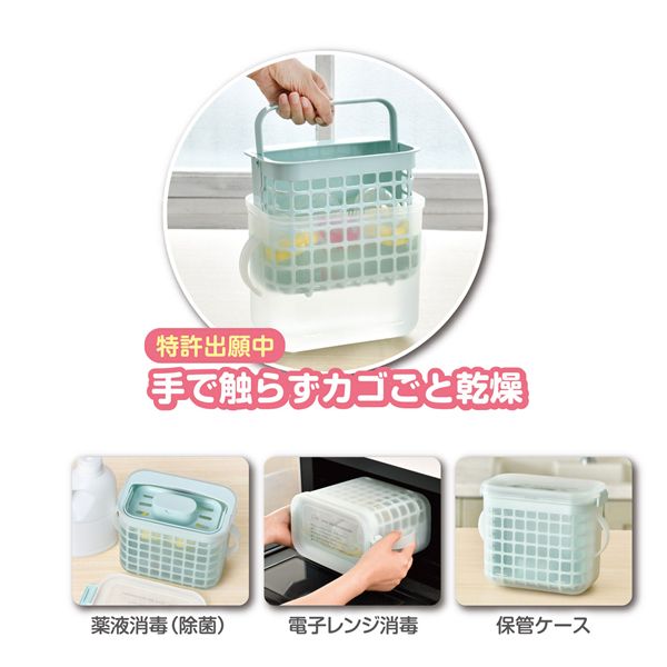 ●電子レンジ消毒は、付属の軽量カップで水を注ぐだけ。レンジでチンして、手で触らずにカゴごと乾燥できるので衛生的です。●500W‾700W出力の電子レンジでお使いになれます。