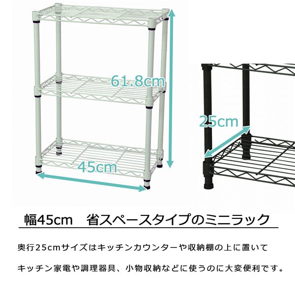 奥行25cmでちょっとしたすき間やキッチンカウンターや棚上に置いたり、様々な用途に使えるスチール製のミニラックです。