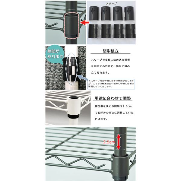 スリーブを支柱にはめ込み棚板を固定するだけで、簡単に組み立てられます。