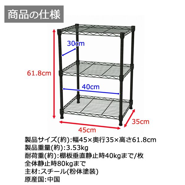 19φスチールラックセット 幅45×奥行35cm 3段 ホワイト
