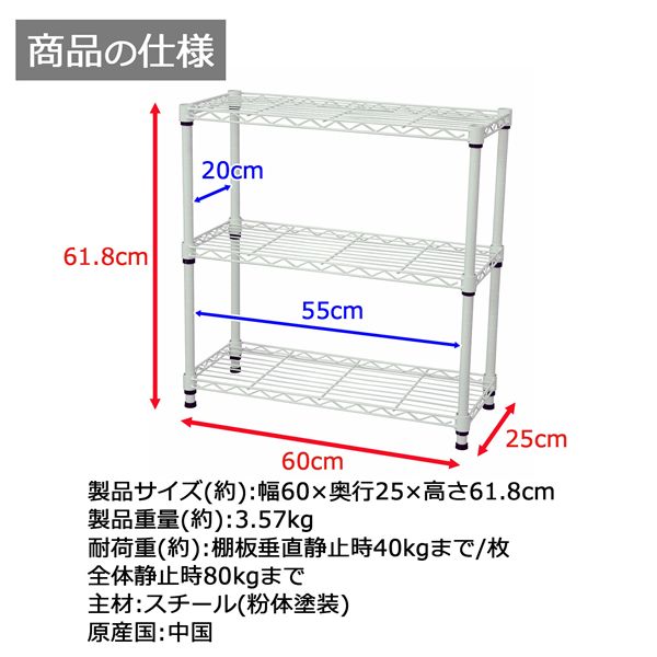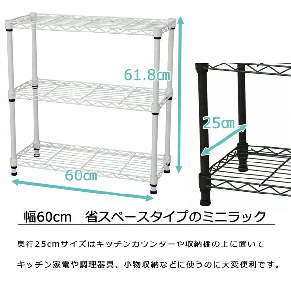 奥行25cmでちょっとしたすき間やキッチンカウンターや棚上に置いたり、様々な用途に使えるスチール製のミニラックです。