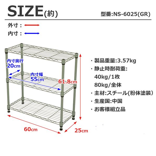 (約):棚板垂直静止時40kgまで/枚、全体静止耐荷重80kgまで