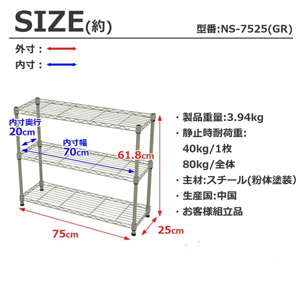 (約):棚板垂直静止時40kgまで/枚、全体静止耐荷重80kgまで
