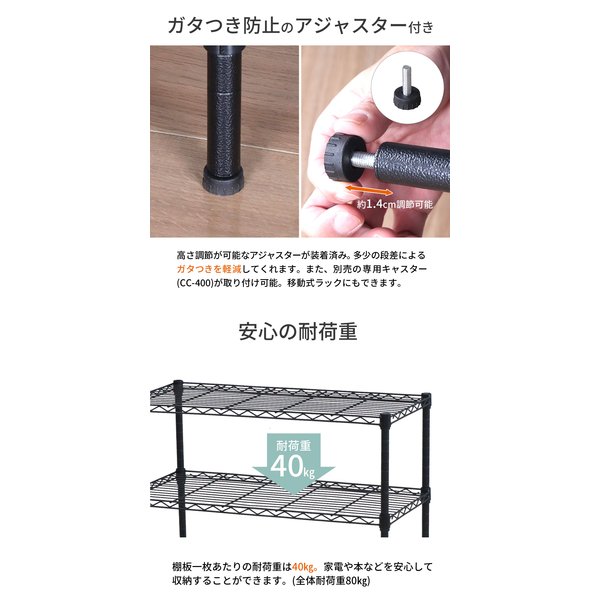 キッチンやリビング、クローゼットやガレージなど様々なシーンで大活躍!アジャスターが付いているので、設置する際のガタつきを微調整することができます。