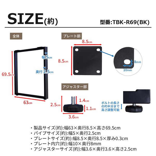 (約)幅63×奥行8.5×高さ69.5cm (付属アジャスター含む)、スチールパイプサイズ(約)幅5×奥行2.5cm、アジャスターサイズ(約):幅3.6×奥行3.6×高さ2.5cm、取付部プレートサイズ(約)幅8.5×奥行8.5×厚み0.3cm、プレート内穴サイズ(約)幅1×奥行0.8cm(楕円形)