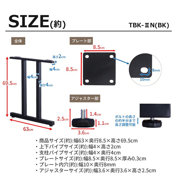 (約)幅63×奥行8.5×高さ69.5cm (付属アジャスター含む)、上下パイプサイズ(約)幅63×高さ2cm、支柱パイプサイズ(約)幅4×奥行4cm、アジャスターサイズ(約)幅3.6×奥行3.6×高さ2.5cm、取付部プレートサイズ(約)幅8.5×奥行8.5×厚み0.3cm、プレート内穴サイズ(約)幅1×奥行0.8cm(楕円形)