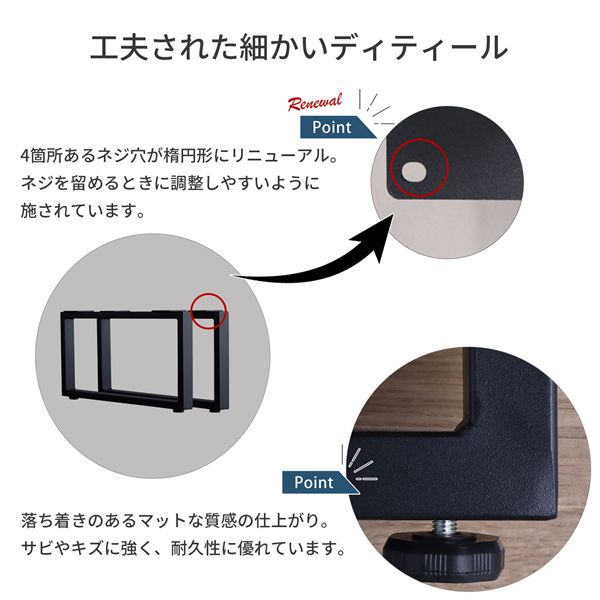 スチール製の太いフレームは、しっかりと天板を支えるので安定感抜群!脚先にアジャスターが付属しており、ガタ付きを調整できます。