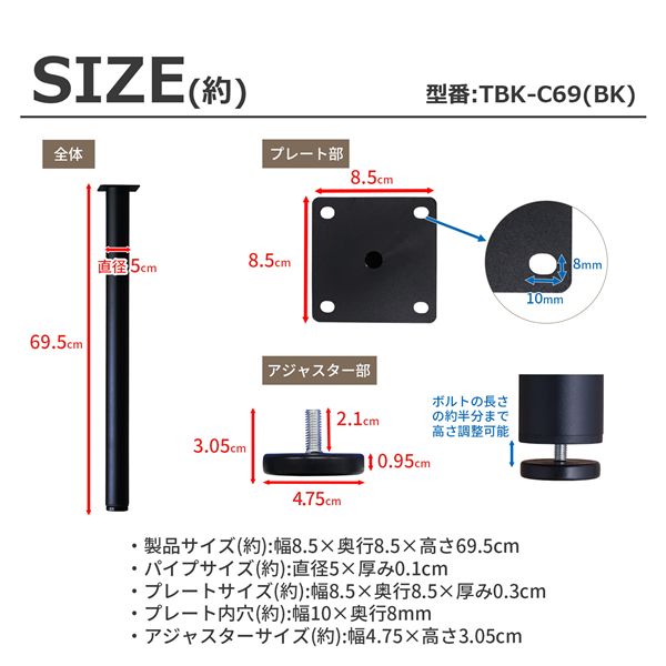 (約)幅8.5×奥行8.5×高さ69.5cm (付属アジャスター含む)、スチールパイプサイズ(約)幅5×奥行0.1cm、アジャスターサイズ(約):直径4.75×厚み0.95cm、ボルト直径0.8cm×長さ2.1cm、取付部プレートサイズ(約)幅8.5×奥行8.5×厚み0.3cm、プレート内穴サイズ(約)幅1×奥行0.8cm(楕円形)