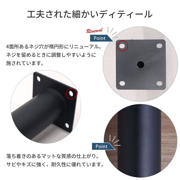 スチール製でしっかりと天板を支えるので、安定感抜群!脚先にアジャスターが付属しており、ガタ付きを調整できます。