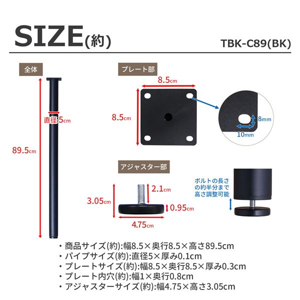 (約)幅8.5×奥行8.5×高さ89.5cm (付属アジャスター含む)、スチールパイプサイズ(約)幅5×奥行0.1cm、アジャスターサイズ(約):直径4.75×厚み0.95cm、ボルト直径0.8cm×長さ2.1cm、取付部プレートサイズ(約)幅8.5×奥行8.5×厚み0.3cm、プレート内穴サイズ(約)幅1×奥行0.8cm(楕円形)