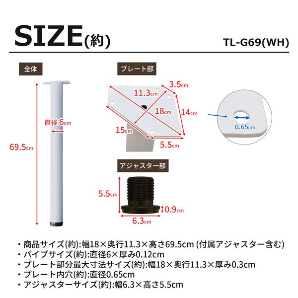 (約)幅18×奥行11.3×高さ69.5cm (付属アジャスター含む)、スチールパイプサイズ(約)直径6cm×厚み0.12cm、アジャスターサイズ(約):直径6.3cm、プレート内穴サイズ(約)直径0.65cm