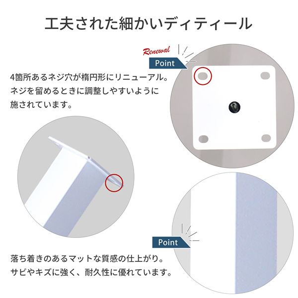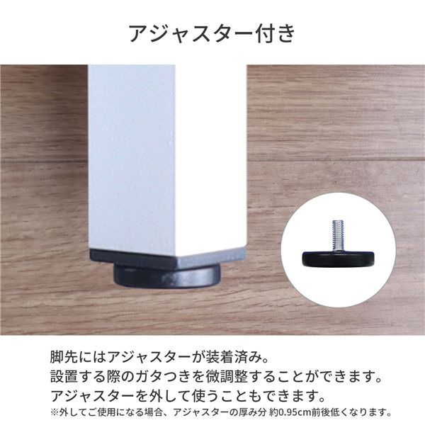 スチール製でしっかりと天板を支えるので、安定感抜群!脚先にアジャスターが付属しており、ガタ付きを調整できます。