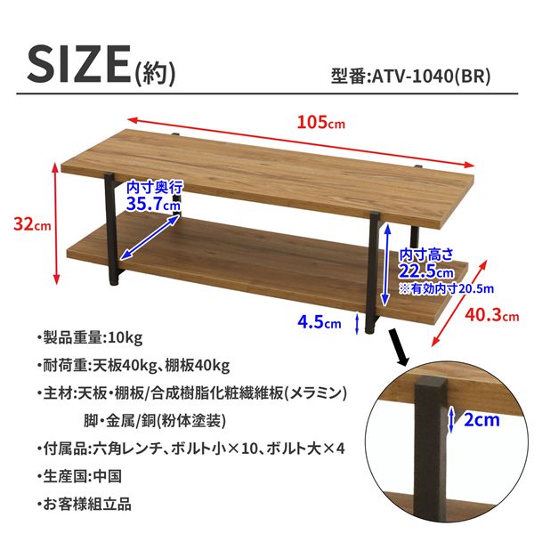 (約)幅105×奥行40.3×高さ32cm、天板・棚板厚さ(約)2.5cm、内寸(約)幅105×奥行35.7×高さ20.5cm