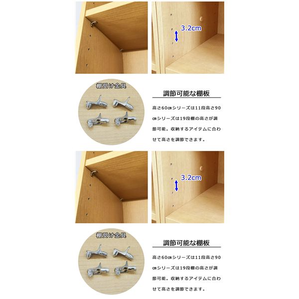 調節可能な可動棚のピッチは3.2cm間隔、高さ60cmシリーズは11段、高さ90cmシリーズは19段棚の高さを調節できるので、収納する物の幅が広がります。