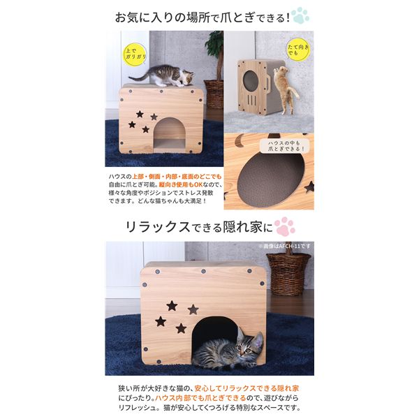 ハウスの上部・側面・内部・底面のいずれの場所でも、猫ちゃんのお気に入りの場所で爪とぎすることができます。