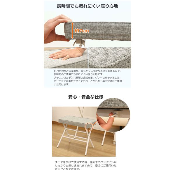 ブラウンはお手入れ簡単な合成皮革、グレーはサラッとしたポリエステル素材を使っており、どちらも一年中快適にご使用頂けます。