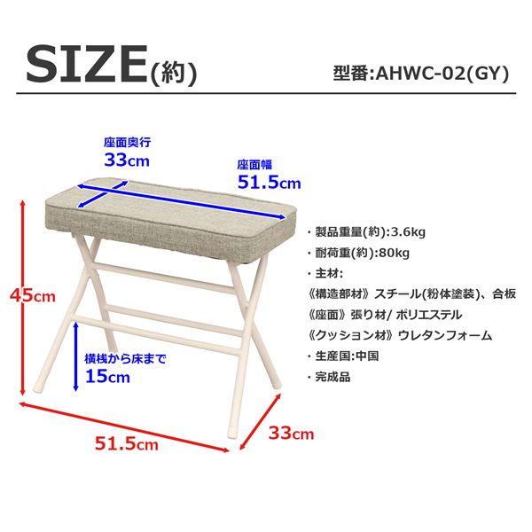 (約)幅51.5×奥行33×座面高さ45cm、座面幅51.5× 奥行き33cm、折りたたみ時サイズ(約)幅51.5×高さ65×厚み12cm
